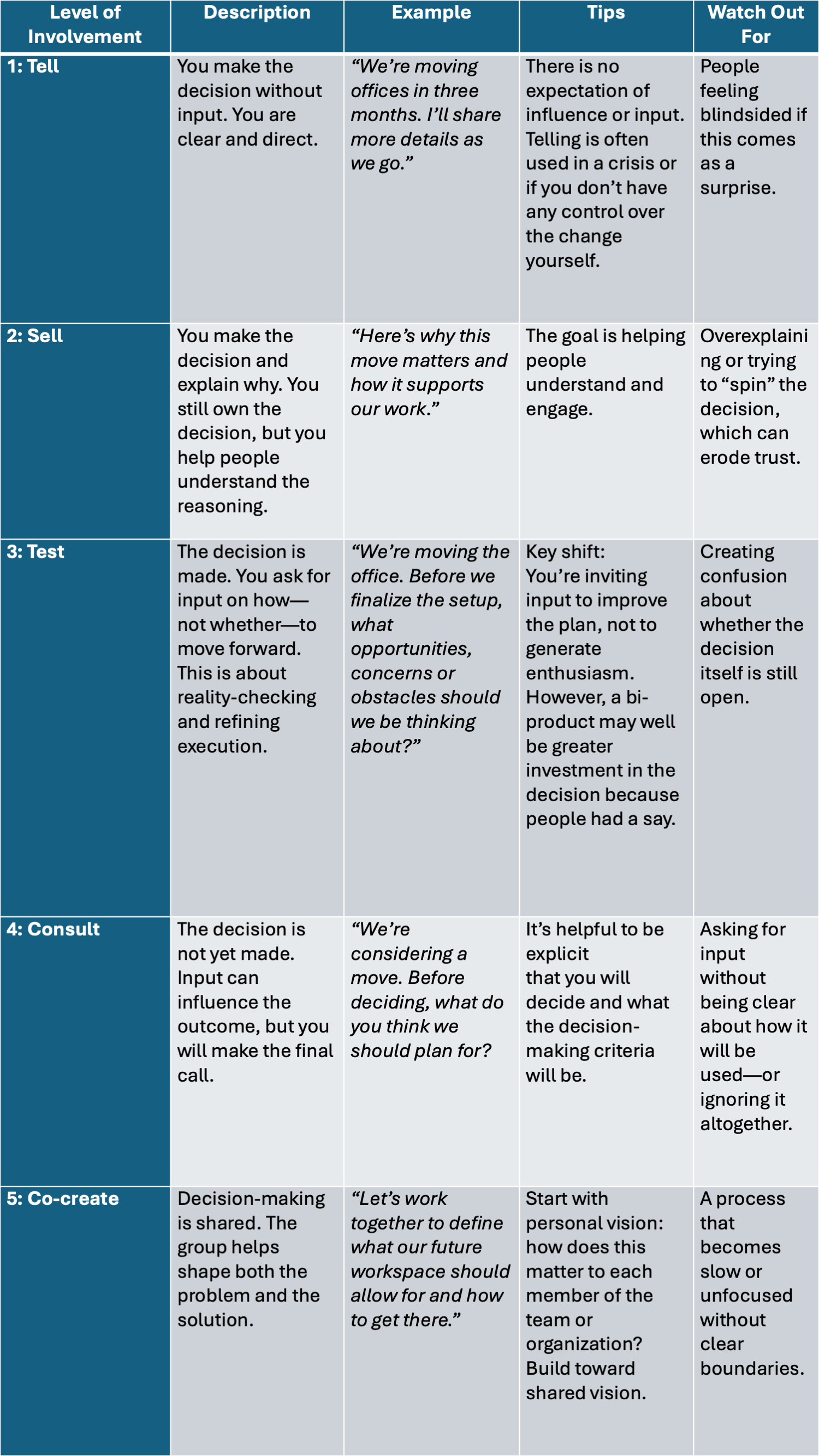 In my last post, I referenced a framework that helps leaders determine the appropriate level of input to seek before making a decision. When paired with a Change Story, it creates clarity about where influence is possible—and where it isn’t.